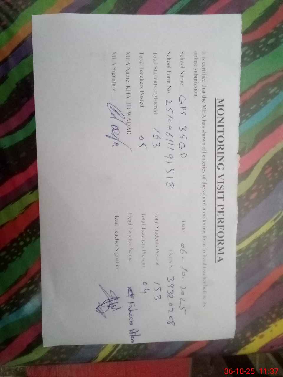 | Attendance Register | Head Teacher | MEA with School | Visit Proof |