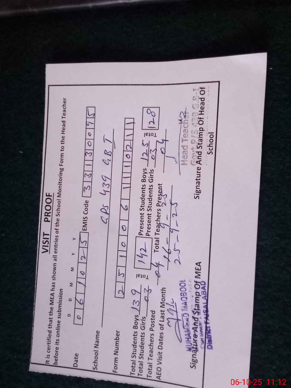 | Attendance Register | Head Teacher | MEA with School | Visit Proof |
