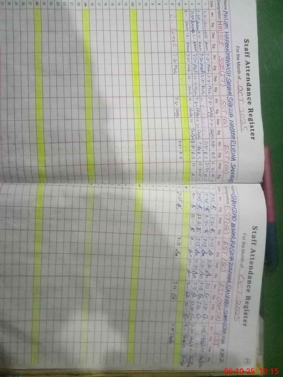 | No. of Students Present - Female | 0 | 0 | 25 | 27 | 25 | 20 | 15 | 10 | 28 | 25 | 21 | 4 | 10 | 210 | ||