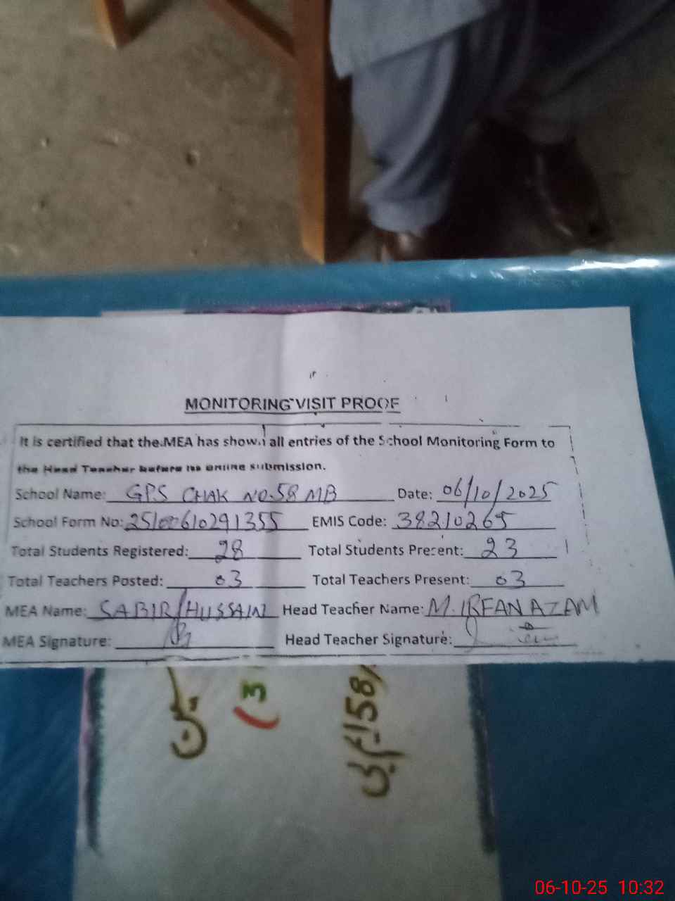 | EMIS Code: 38210265 | Name of School: GPS CHAK NO. 58 MB | |||
