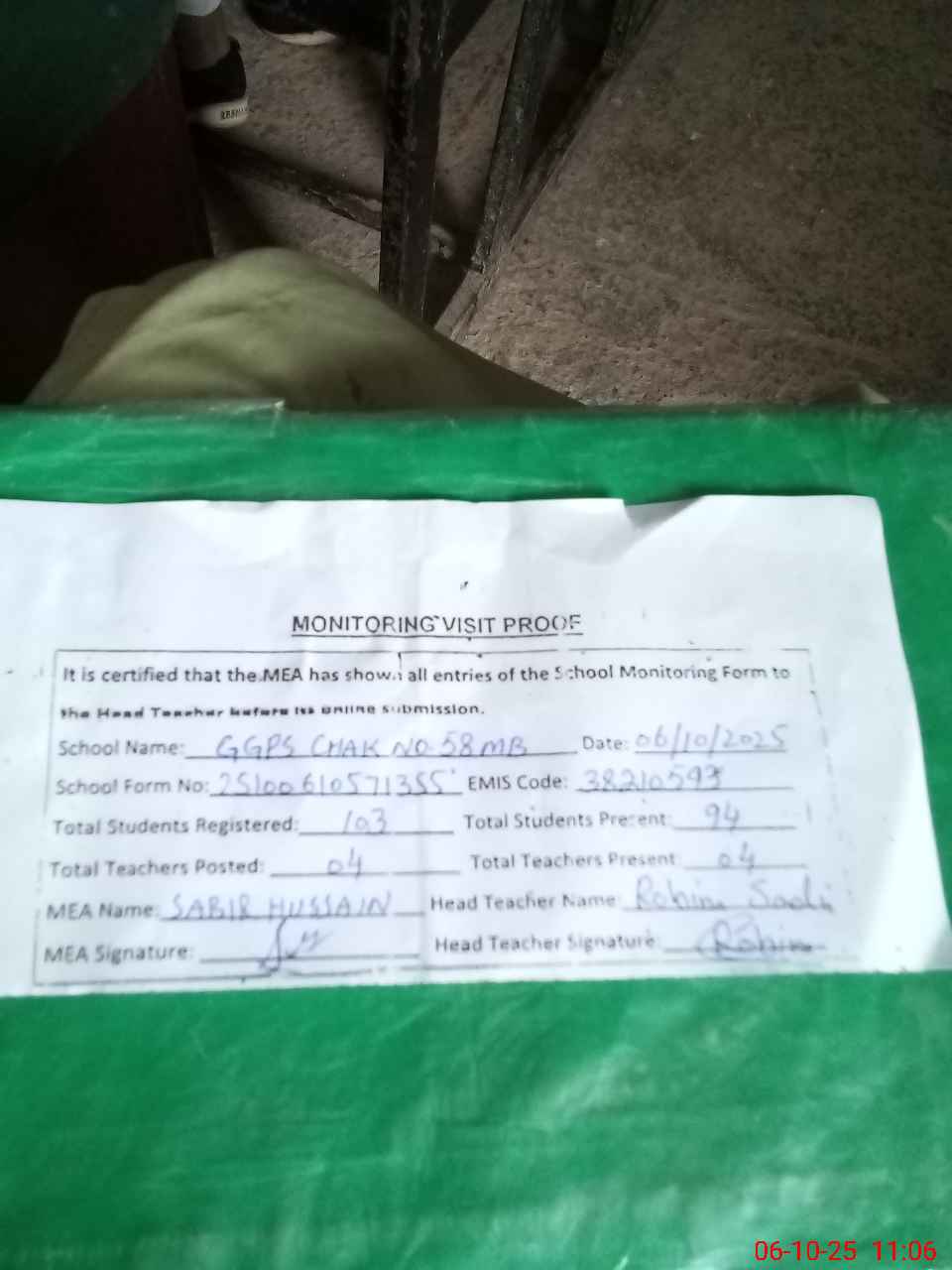 | Certified that this School was Inspected by the Undersigned MEA/DMO Today and the Information Stated Above is as Per Record. | |||||