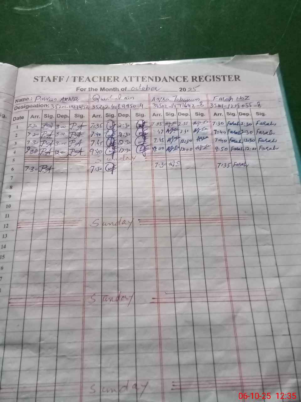 | Remarks (Use Separate Page if Required): Two toilets found locked Only one soap at students hand wash points Wash club is not functional as students are not using toilets properly PST Mehra Azam is absent since 7 July 2025 Sweeper Faisal Fayyaz is absent today and he seems habitual as he was absent two times in previous month Present students percentage is 45 percent 35220315 | |||||