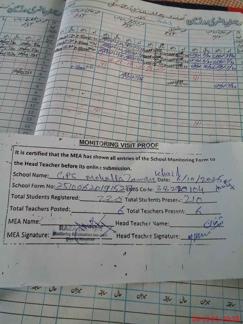 | Attendance Register | Head Teacher | MEA with School | Visit Proof |