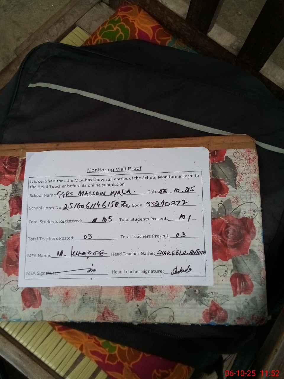 | Certified that this School was Inspected by the Undersigned MEA/DMO Today and the Information Stated Above is as Per Record. | |||||