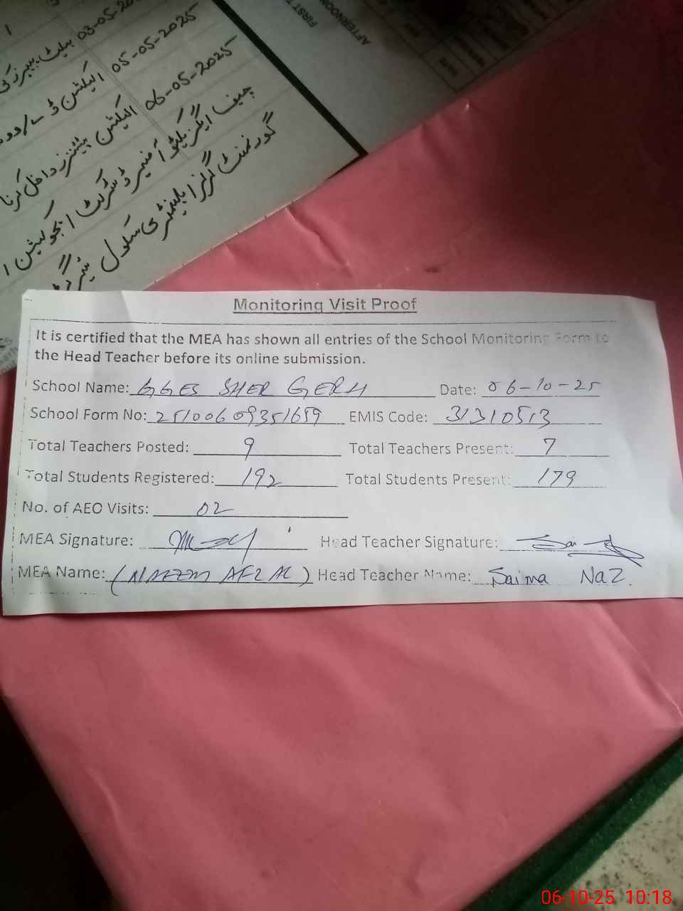 | Monitoring Date: 06-10-2025 | Start Time: 06-10-2025 09:34 AM | End Time: 06-10-2025 10:18 AM | Name of MEA: Na**** Af**** | |