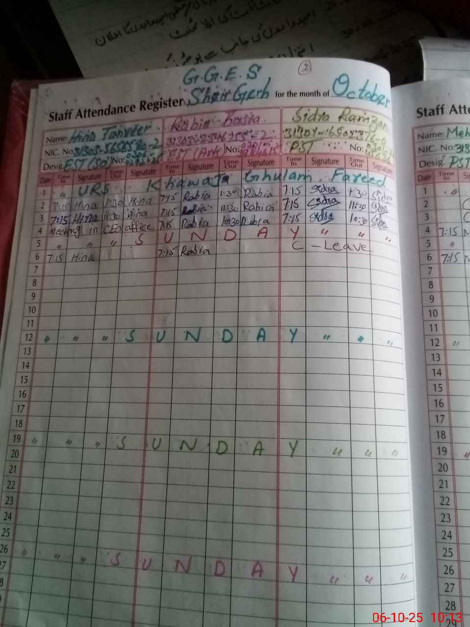 | CNIC | Full Name | Designation | R/C | Absence During Last Calender Month |