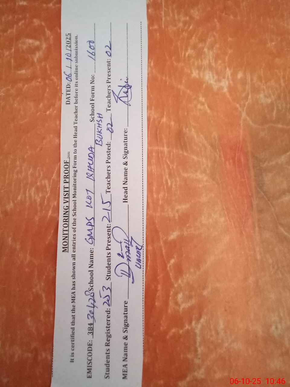 | Certified that this School was Inspected by the Undersigned MEA/DMO Today and the Information Stated Above is as Per Record. | |||||