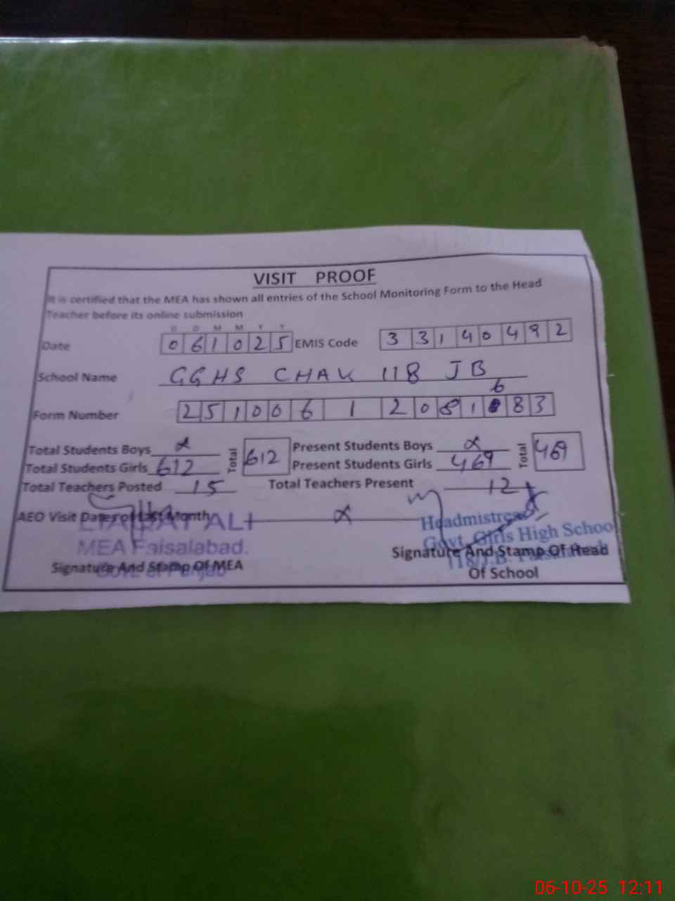 | EMIS Code: 33140492 | Name of School: GGHS CHAK 118 JB | |||