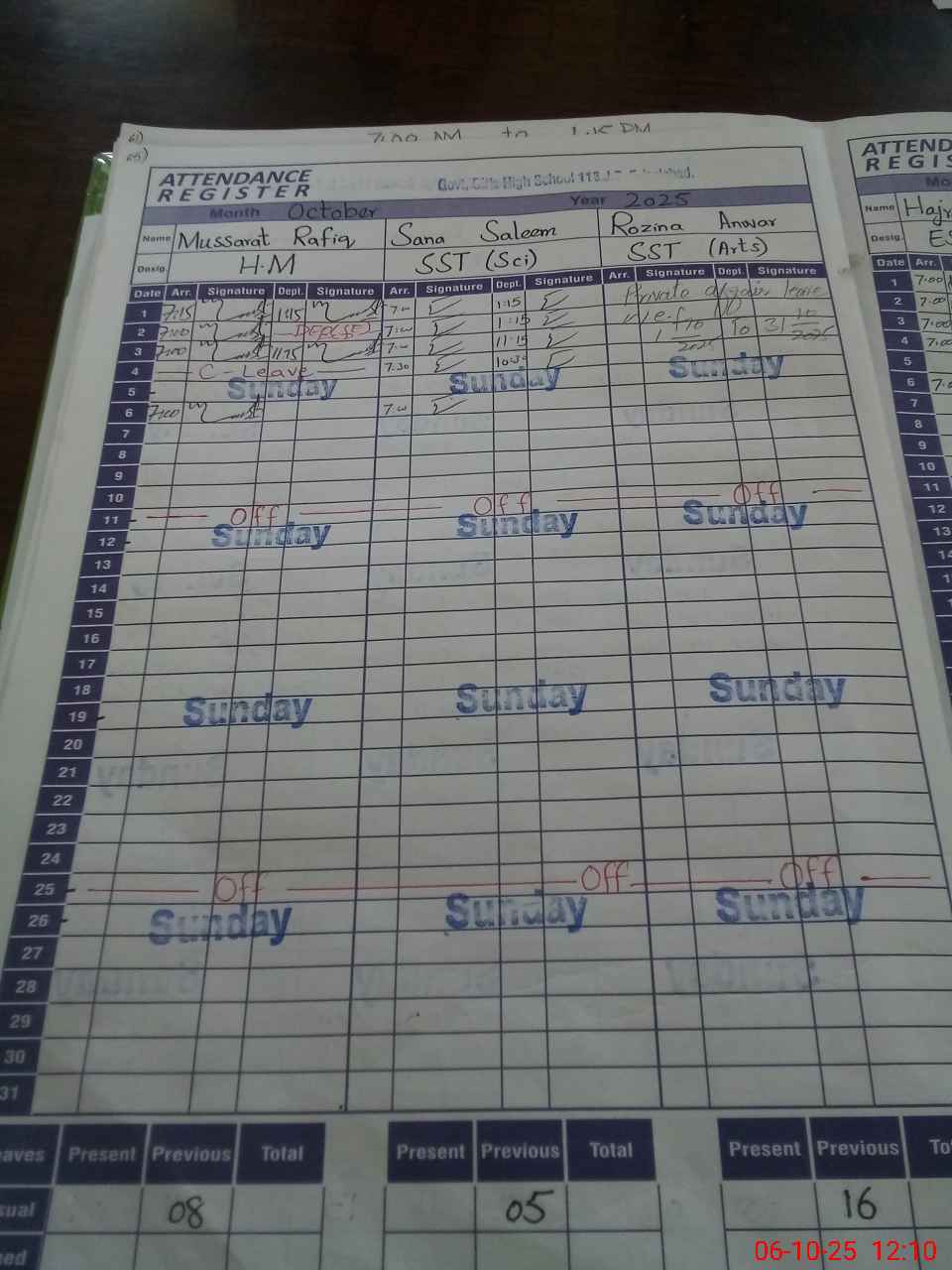 | Remarks (Use Separate Page if Required): SST Rozina Anwar marked on teacher attendance register on earned leave for private affairs wef 01 October 2025 to 31 October 2025 but no approved leave application or any sectioned record available so marked her unauthorized absent from duty | |||||