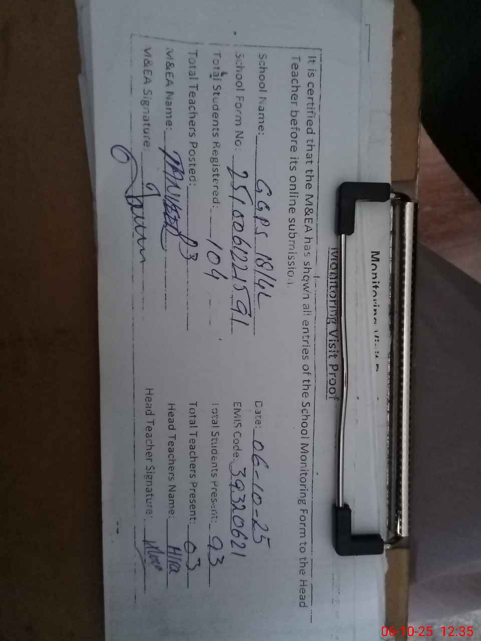 | Attendance Register | Head Teacher | MEA with School | Visit Proof |