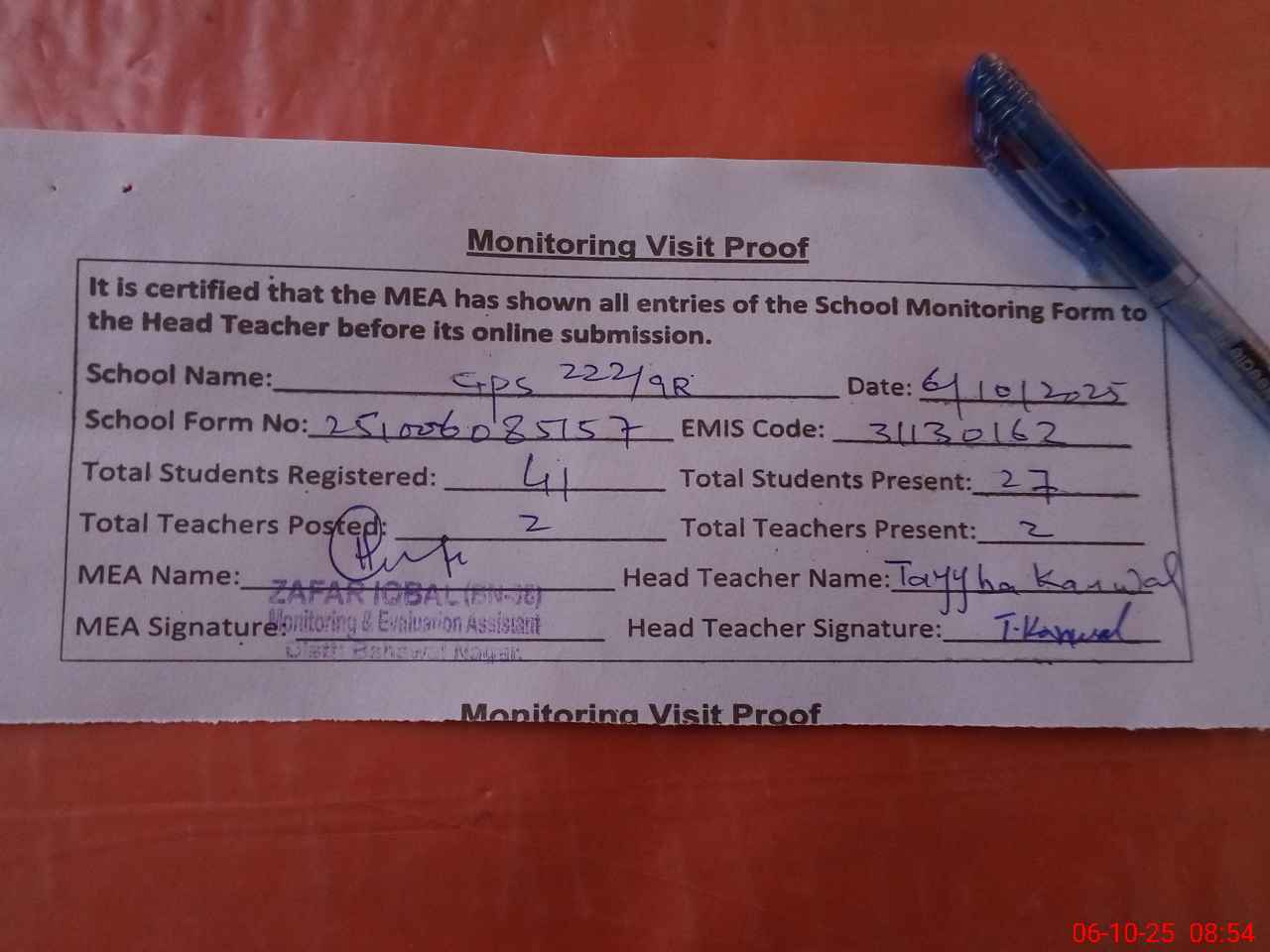 | Attendance Register | Head Teacher | MEA with School | Visit Proof |