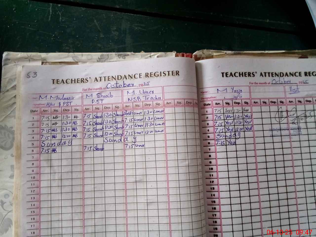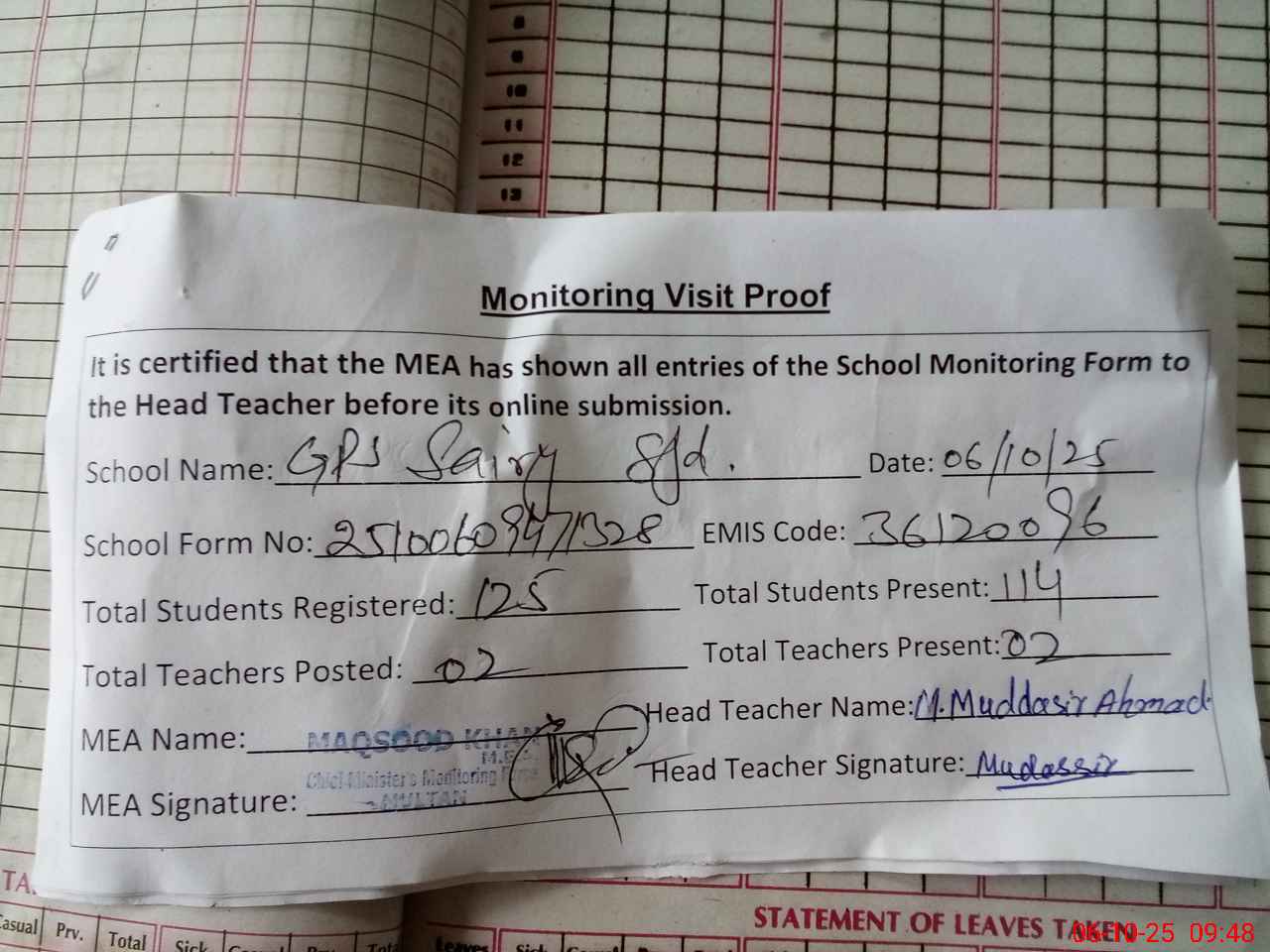 | Attendance Register | Head Teacher | MEA with School | Visit Proof |