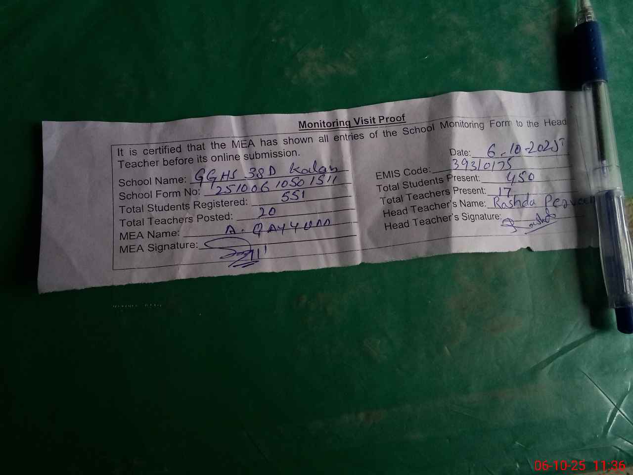 | Attendance Register | Head Teacher | MEA with School | Visit Proof |