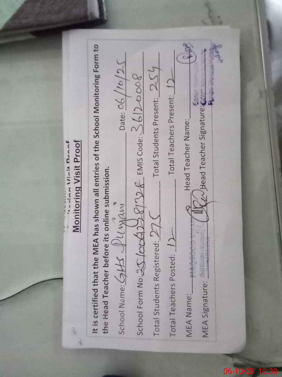 | Attendance Register | Head Teacher | MEA with School | Visit Proof |