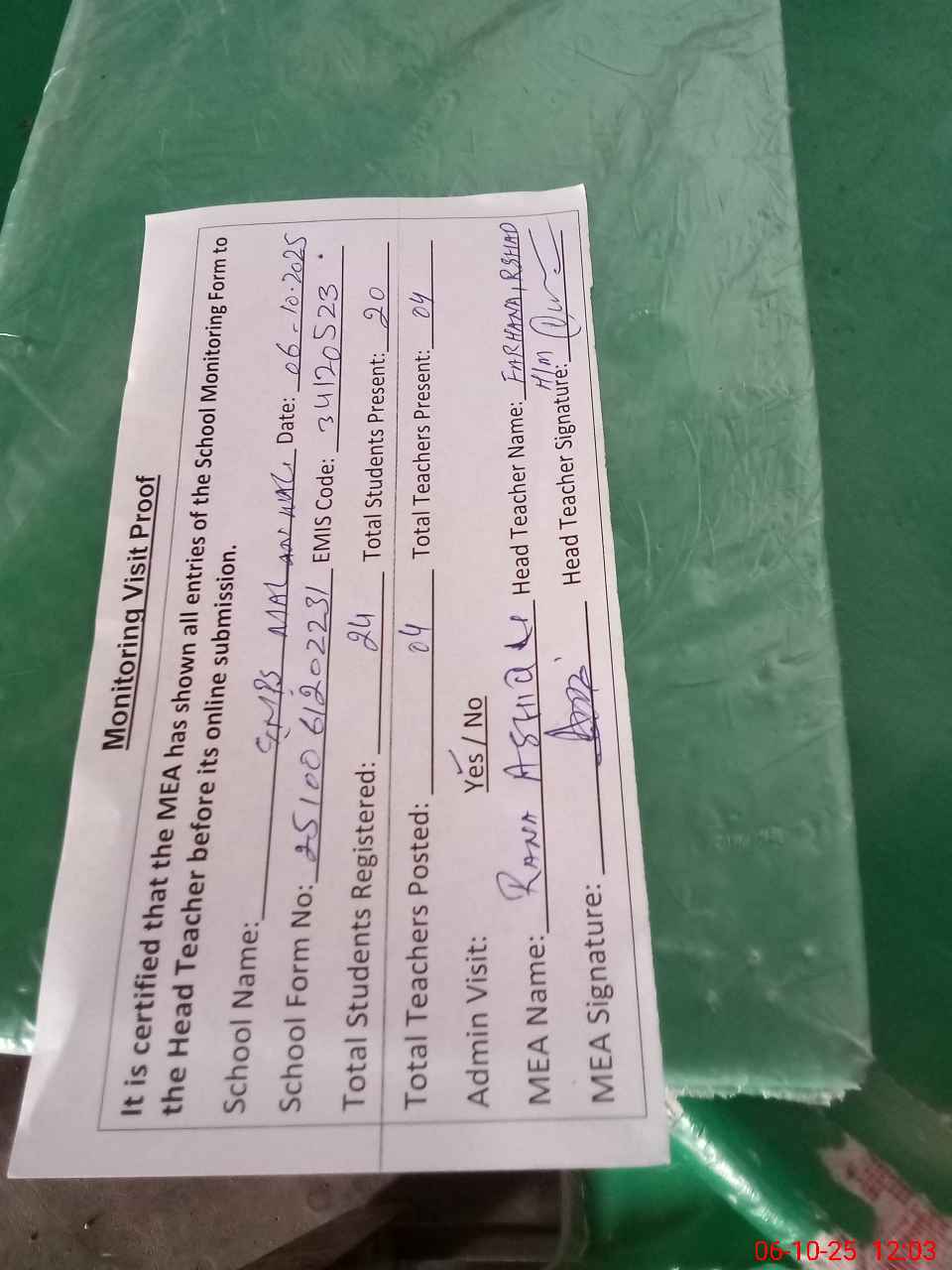 | Attendance Register | Head Teacher | MEA with School | Visit Proof |