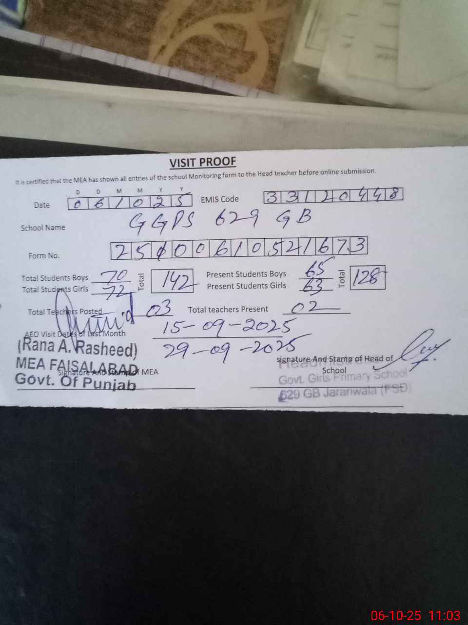 | Attendance Register | Head Teacher | MEA with School | Visit Proof |