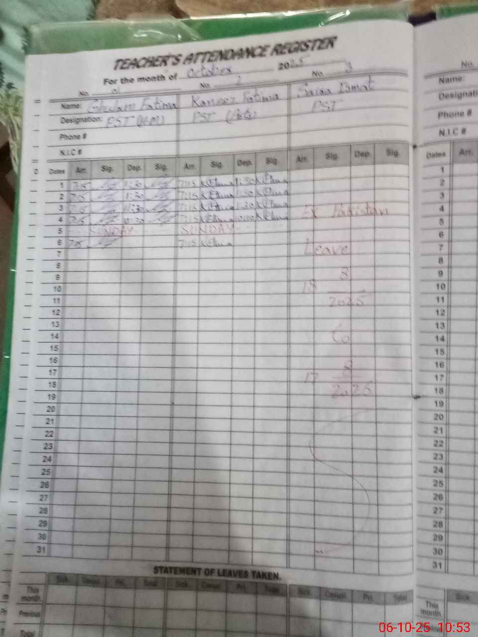| Leave | Duty | Absent | Maternity | Medical | Ex- Pak |