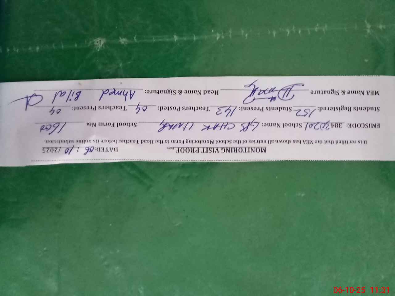 | Certified that this School was Inspected by the Undersigned MEA/DMO Today and the Information Stated Above is as Per Record. | |||||