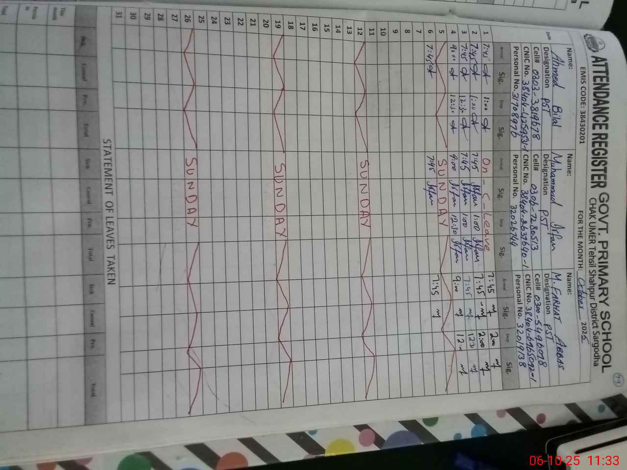 | Name: AH**** BI**** Designation: (School Headmaster's/Headmistress's) PST (Sc-Math) Phone/Cell Number: 03**** |
