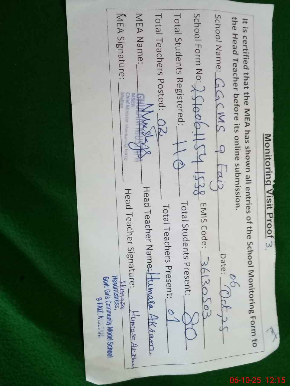 | Monitoring Date: 06-10-2025 | Start Time: 06-10-2025 11:54 AM | End Time: 06-10-2025 12:16 PM | Name of MEA: Gh**** Mu**** | |