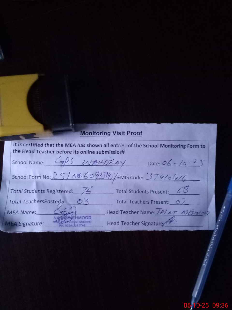 | EMIS Code: 37410416 | Name of School: GPS WAHDRAY | |||