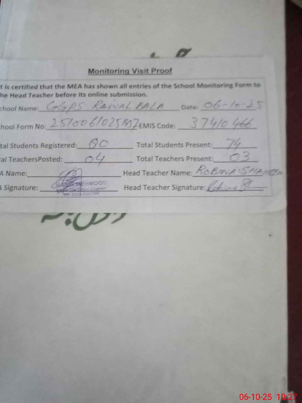 | EMIS Code: 37410466 | Name of School: GGPS RAWAL BALA | |||