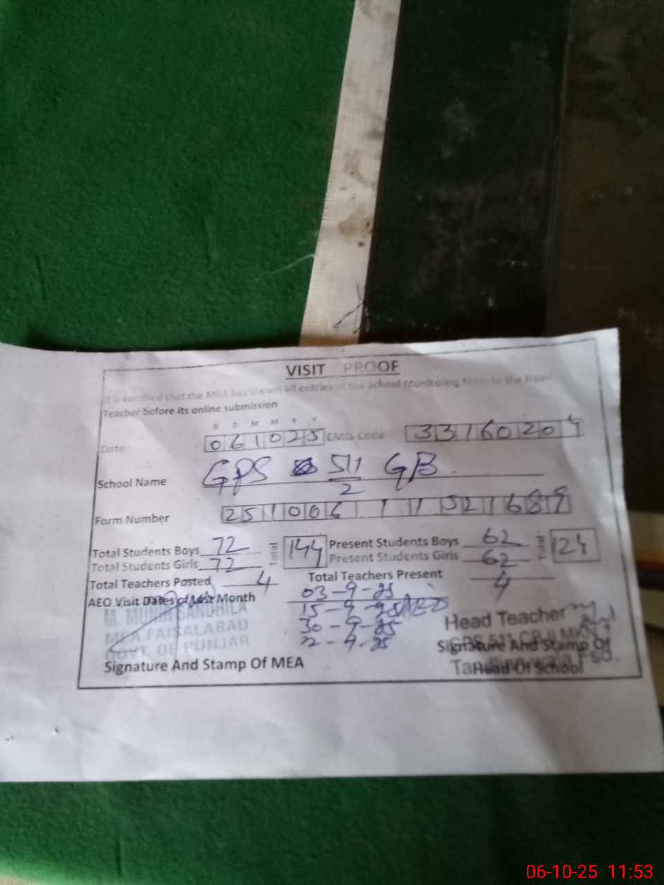 | Attendance Register | Head Teacher | MEA with School | Visit Proof |