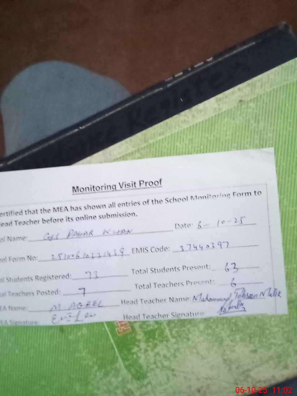 | Attendance Register | Head Teacher | MEA with School | Visit Proof |