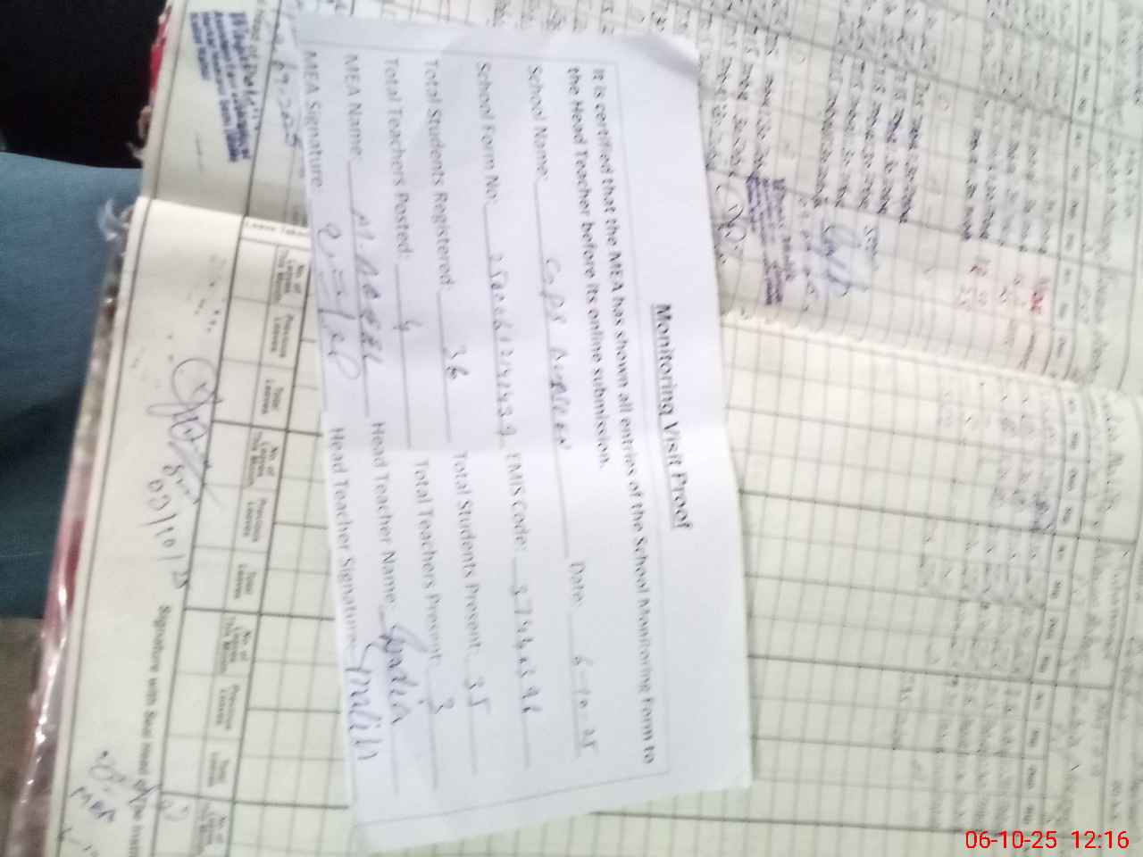 | Attendance Register | Head Teacher | MEA with School | Visit Proof |