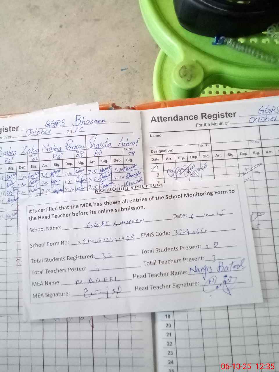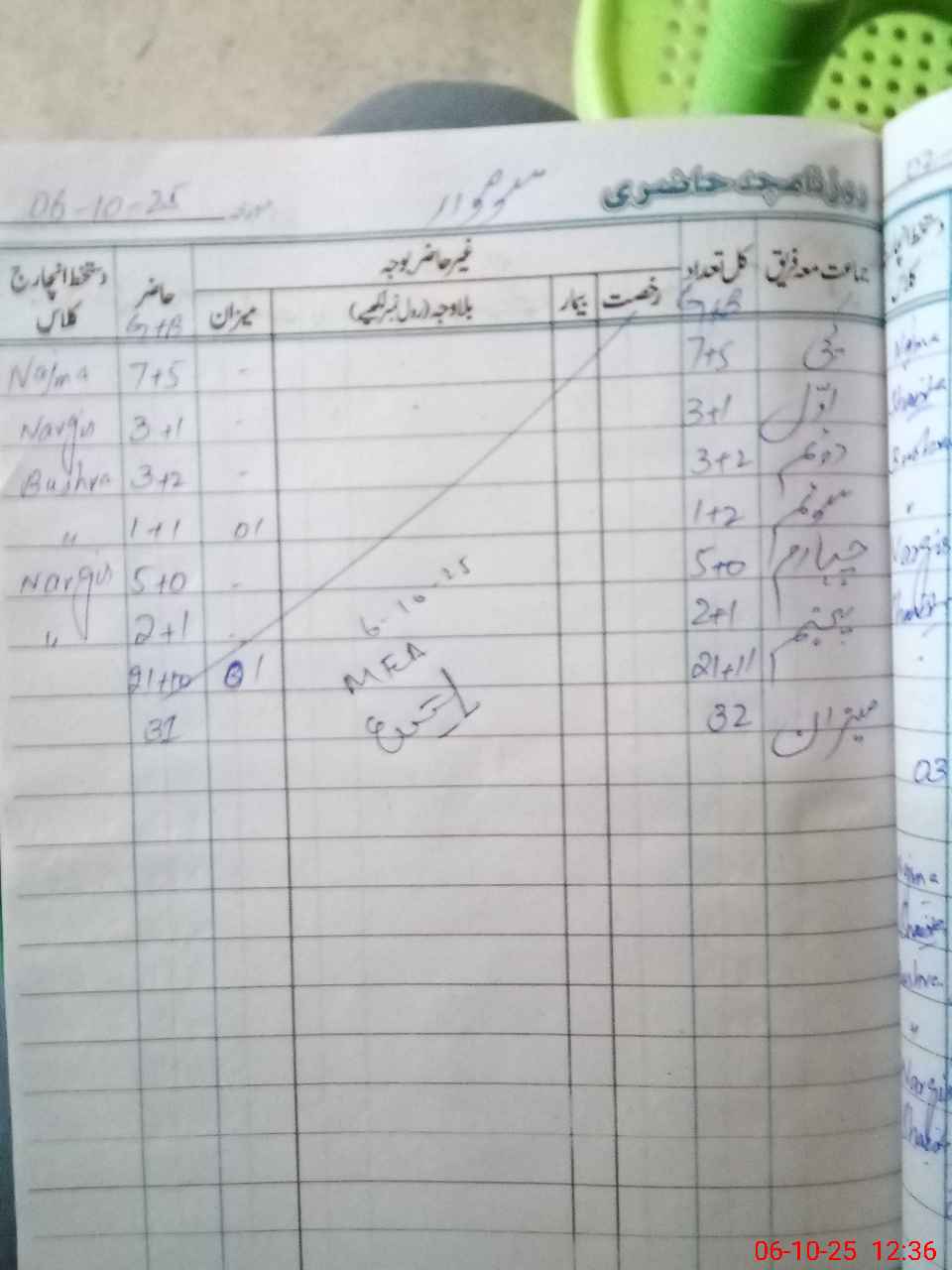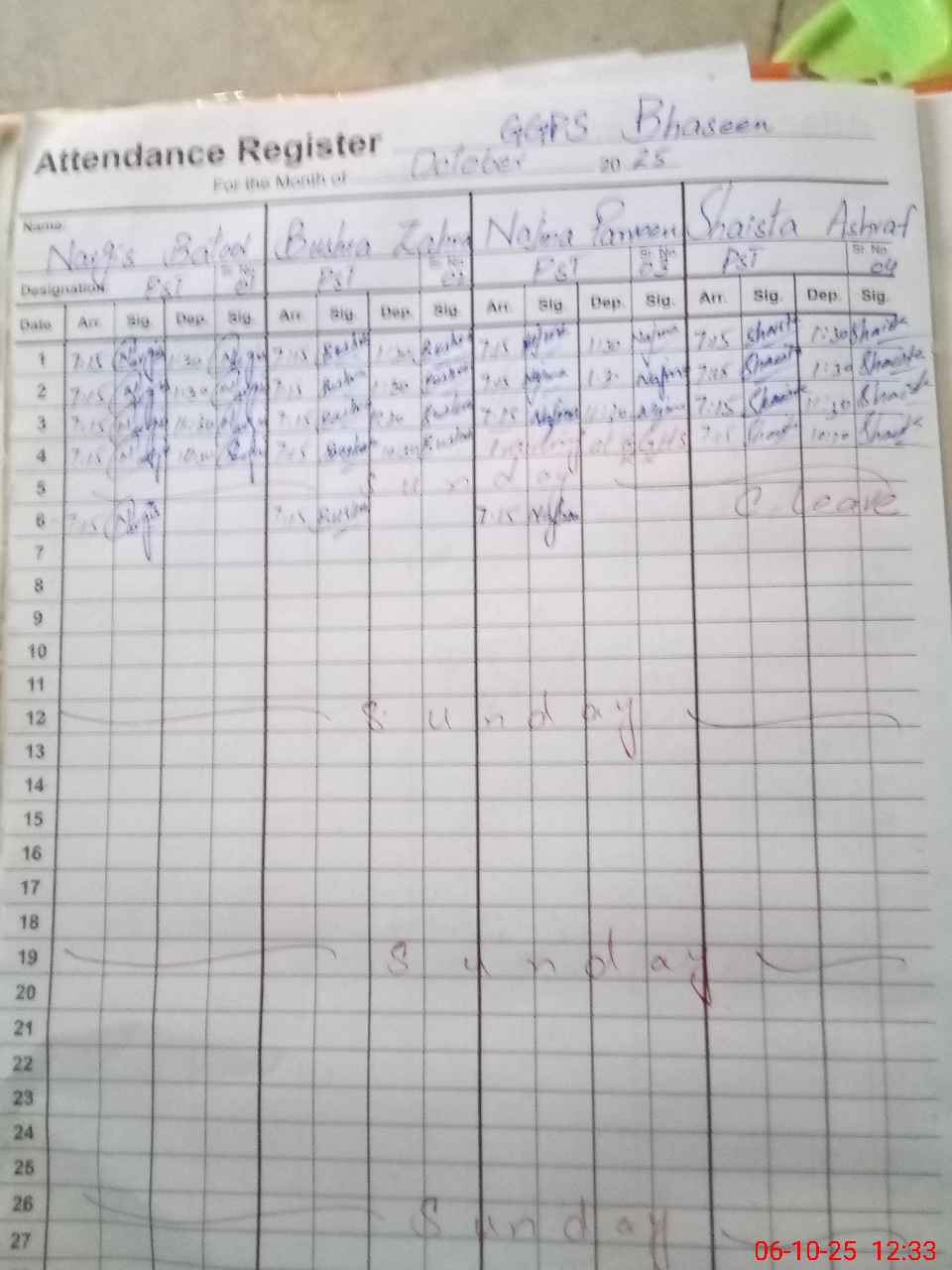 | Remarks (Use Separate Page if Required): Teacher shaista ashraf leave waiting for approvel from AEO | |||||