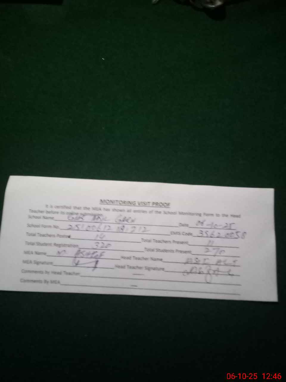 | Attendance Register | Head Teacher | MEA with School | Visit Proof |