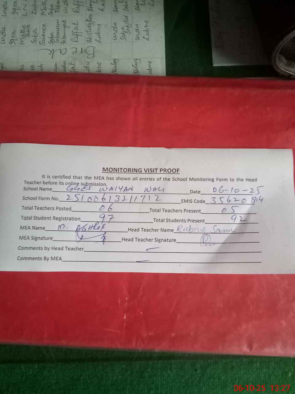 | Attendance Register | Head Teacher | MEA with School | Visit Proof |