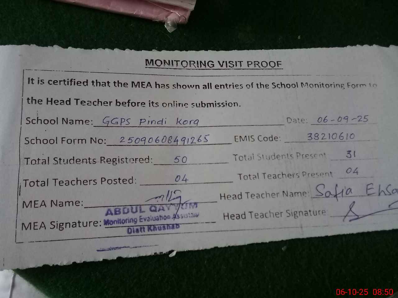 | Attendance Register | Head Teacher | MEA with School | Visit Proof |