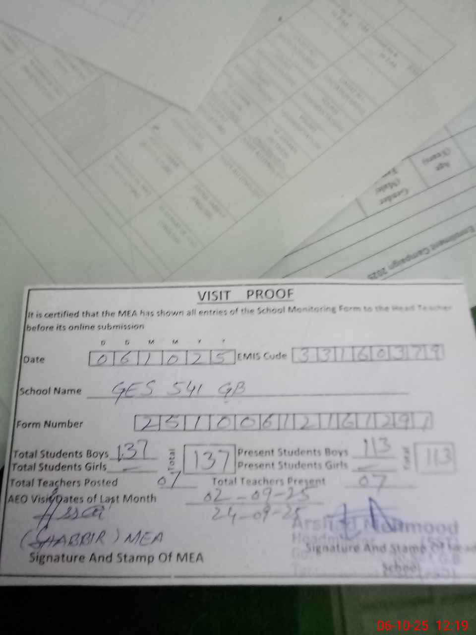 | Attendance Register | Head Teacher | MEA with School | Visit Proof |