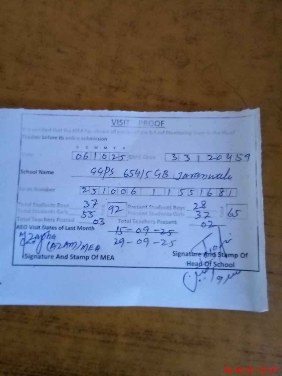 | Attendance Register | Head Teacher | MEA with School | Visit Proof |