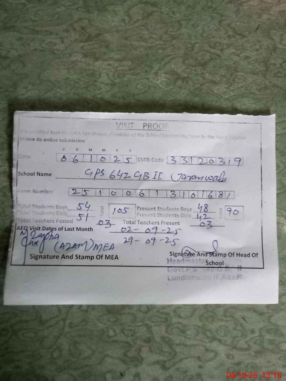 | Attendance Register | Head Teacher | MEA with School | Visit Proof |