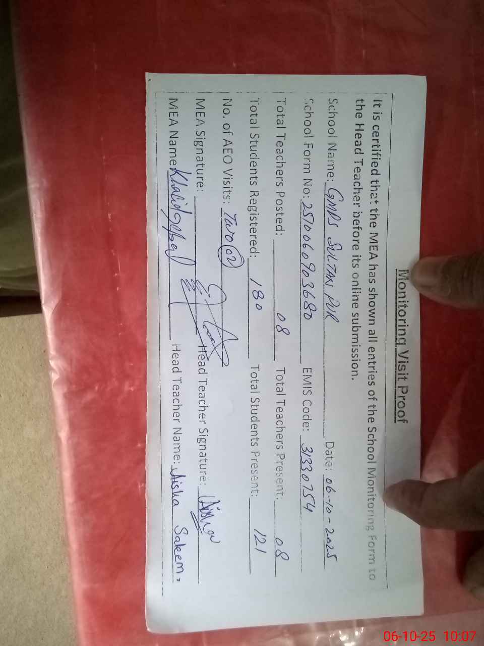 | EMIS Code: 31330754 | Name of School: GMPS SULTAN PUR | |||