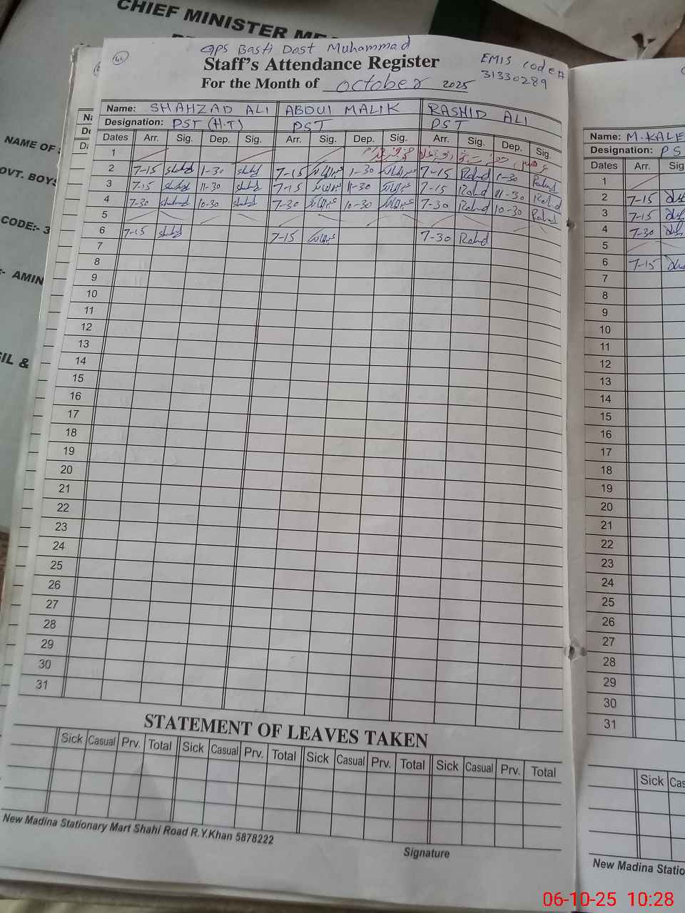 | CNIC | Full Name | Designation | R/C | Absence During Last Calender Month |