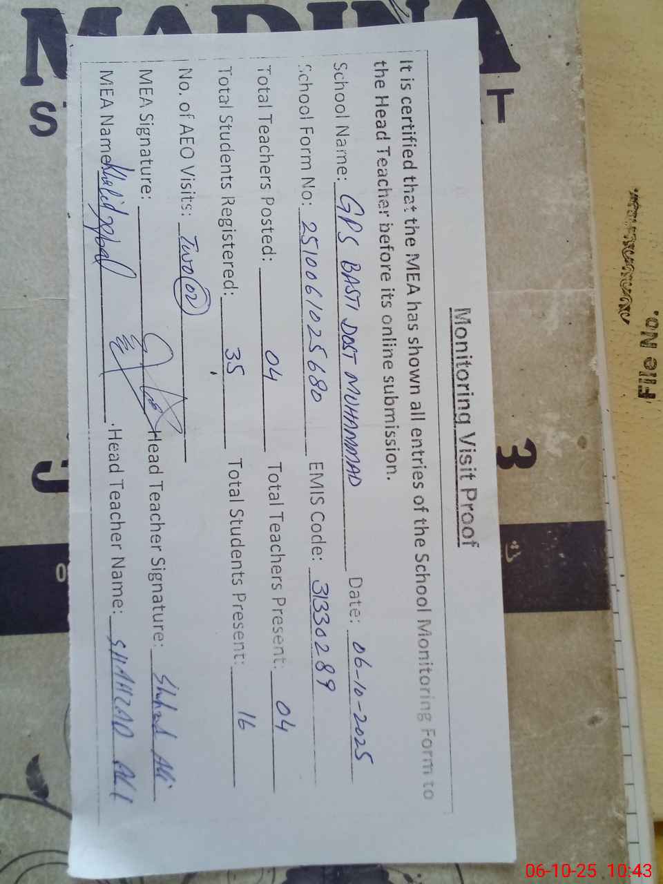 | Attendance Register | Head Teacher | MEA with School | Visit Proof |