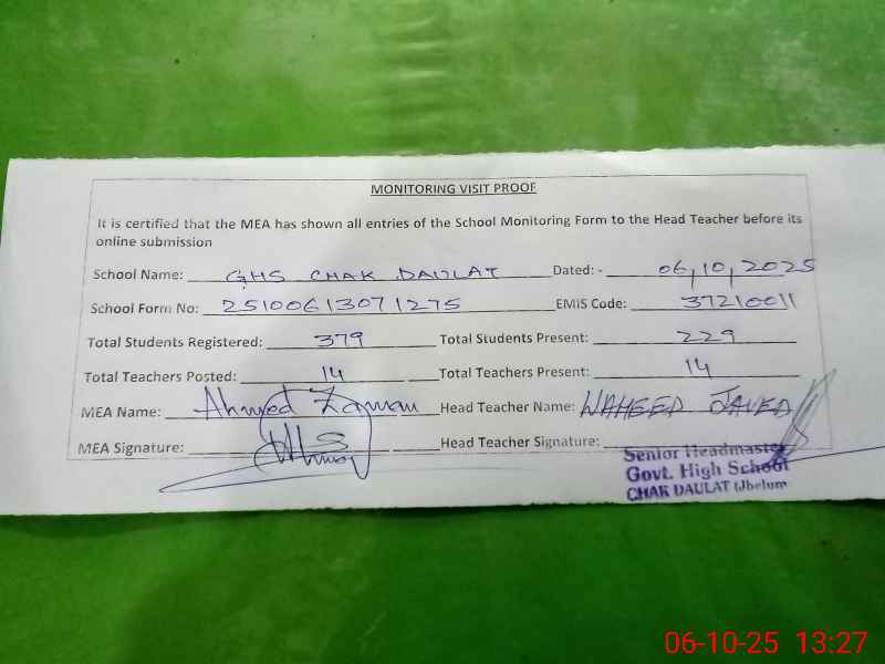 | EMIS Code: 37210011 | Name of School: GHS CHAK DAULAT | |||