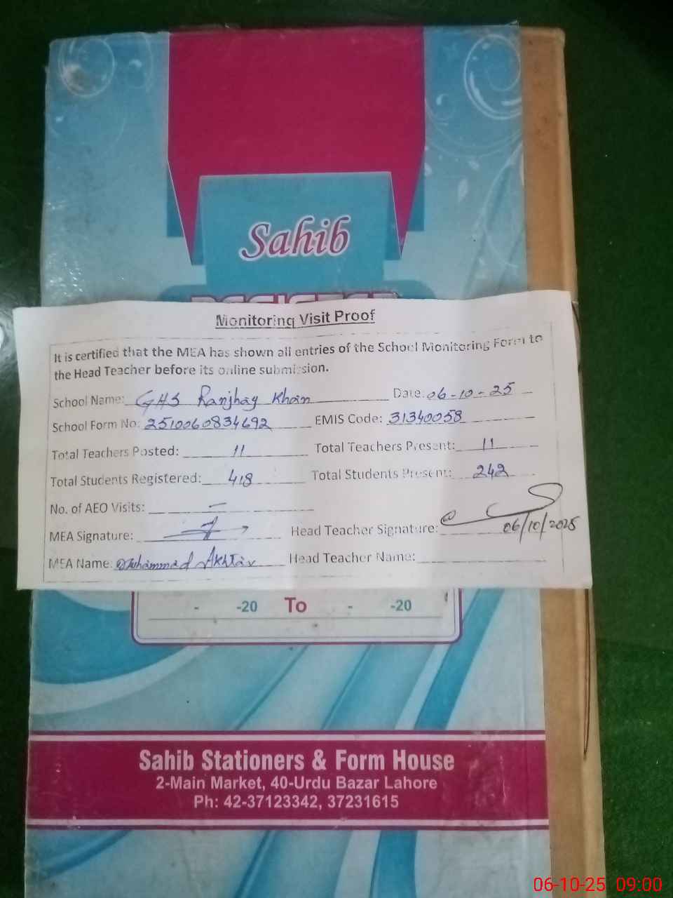 | EMIS Code: 31340058 | Name of School: GHS RANJHAY KHAN | |||