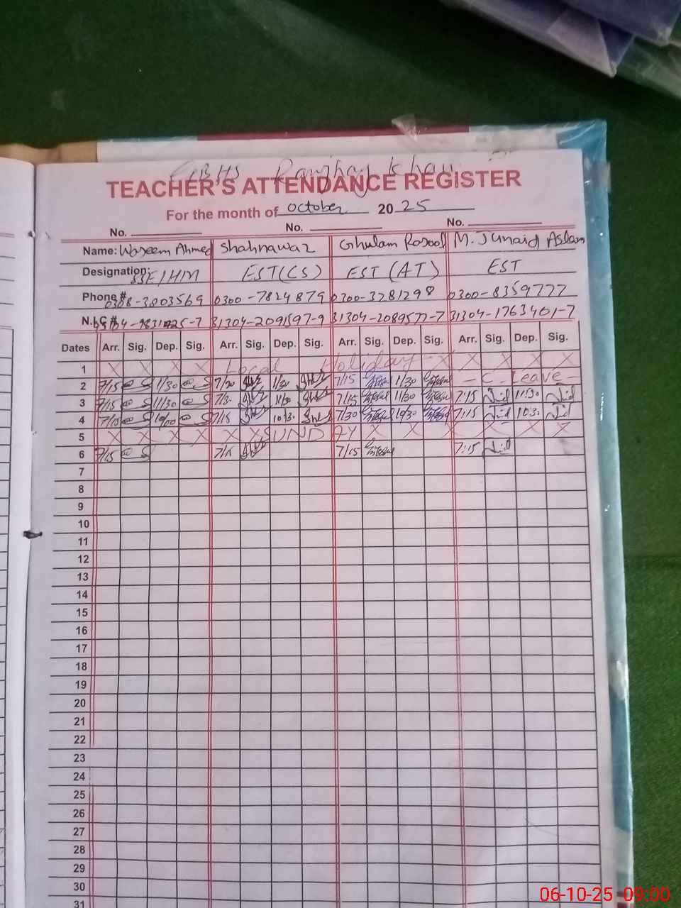 | CNIC | Full Name | Designation | R/C | Absence during last cal. month |