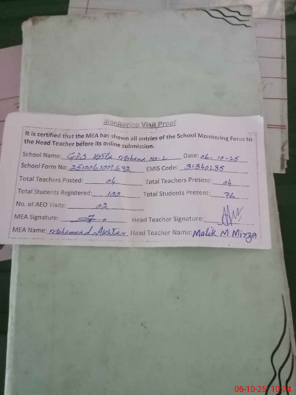 | Attendance Register | Head Teacher | MEA with School | Visit Proof |