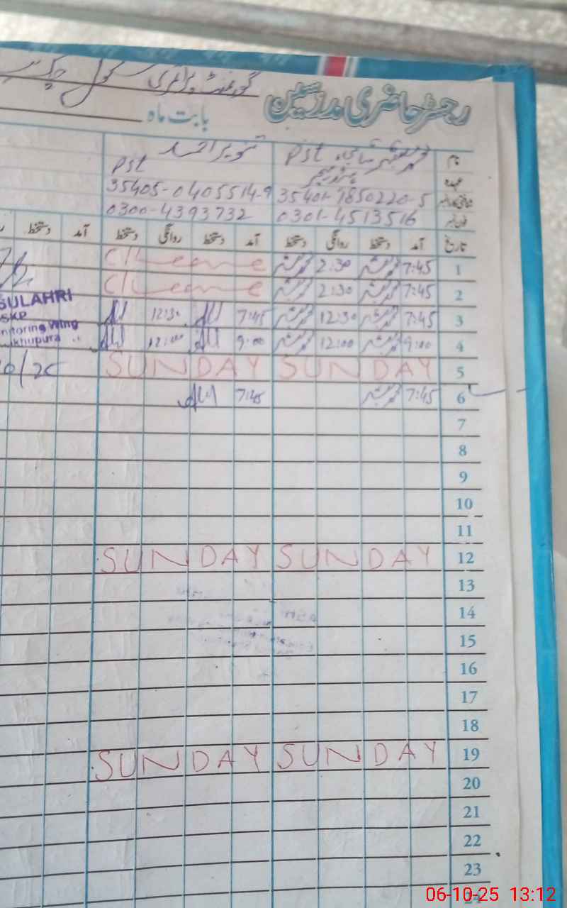 | CNIC | Full Name | Designation | R/C | Absence During Last Calender Month |