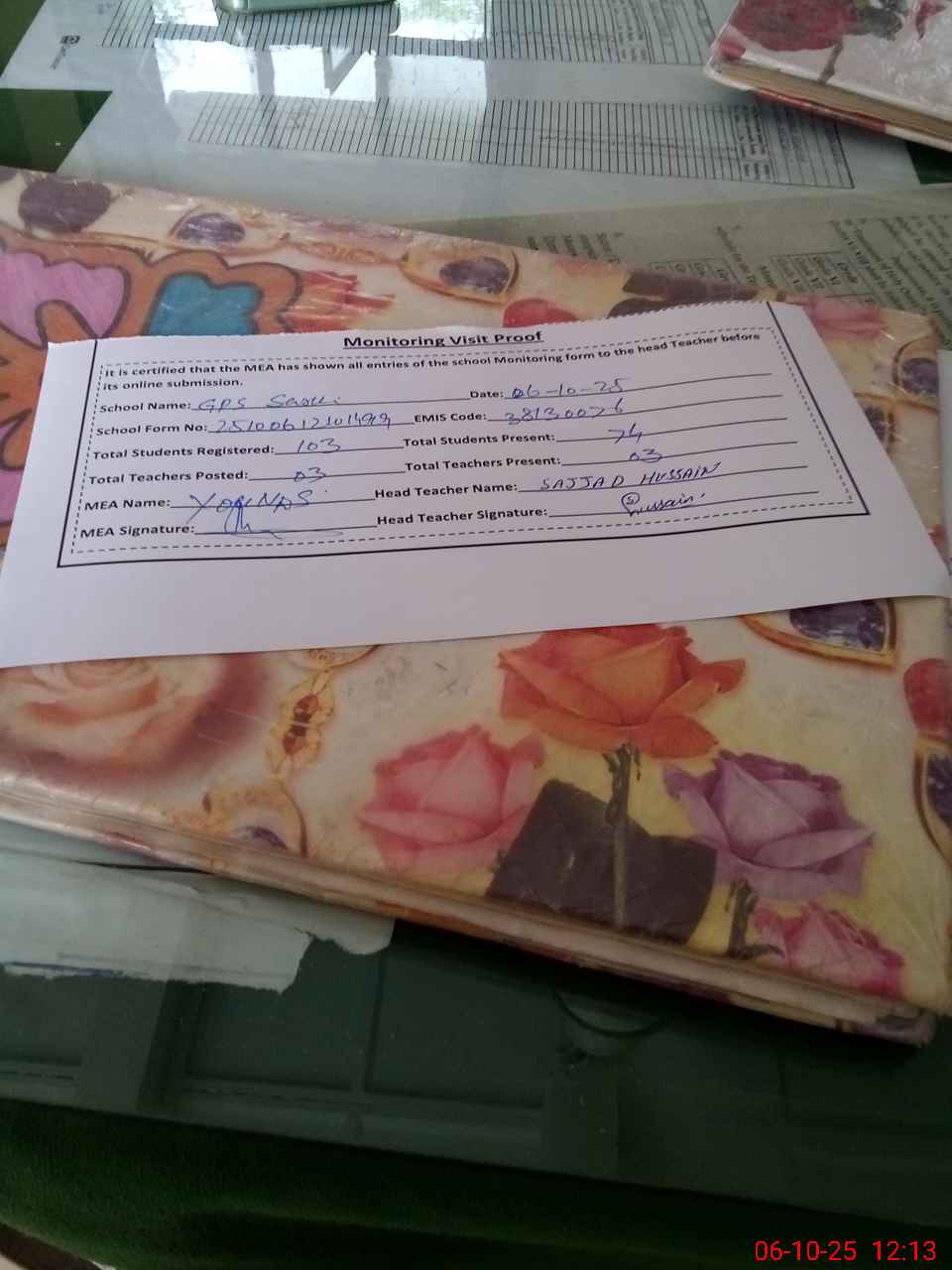 | Attendance Register | Head Teacher | MEA with School | Visit Proof |