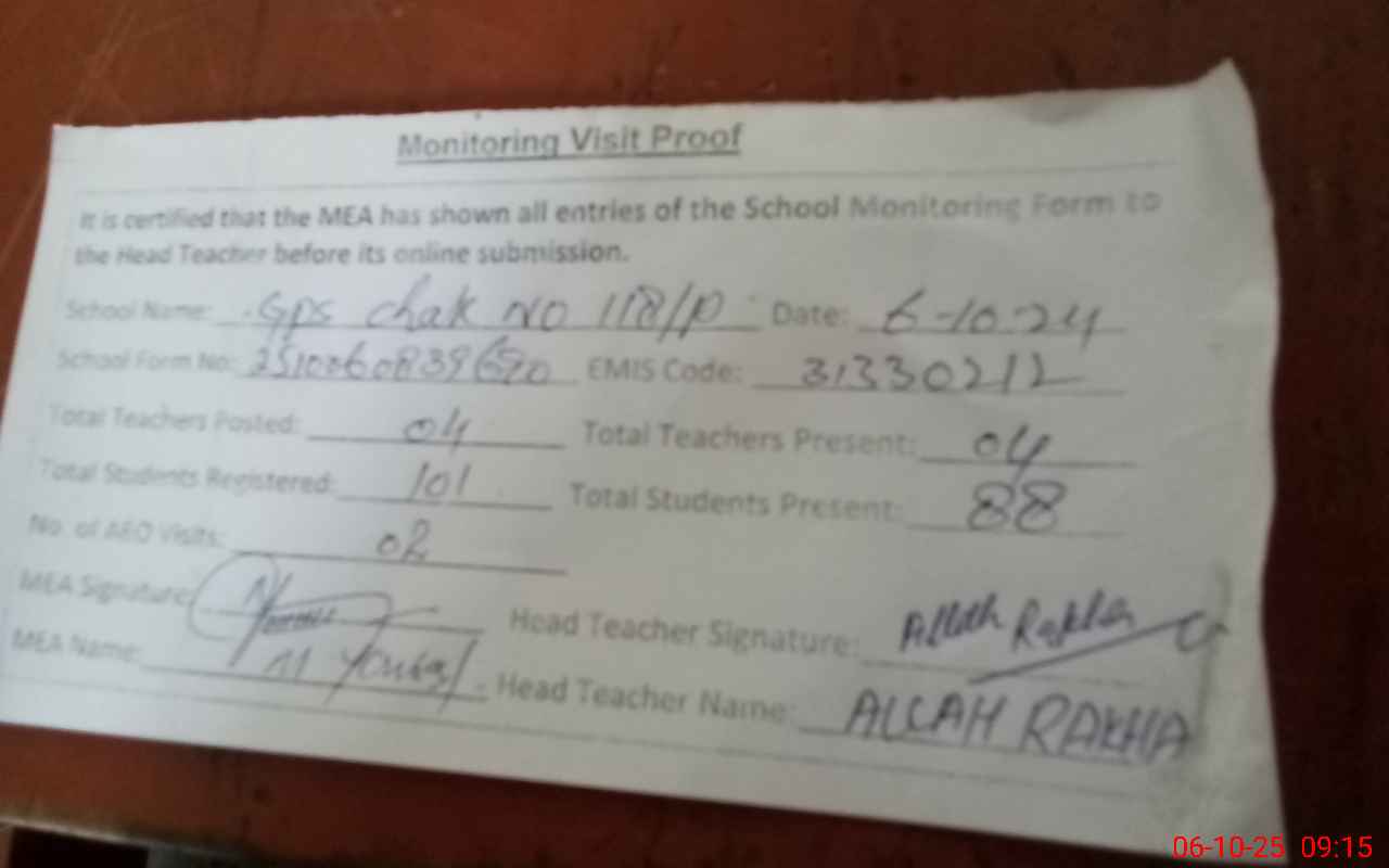 | EMIS Code: 31330212 | Name of School: GPS CHAK NO 118/P | |||