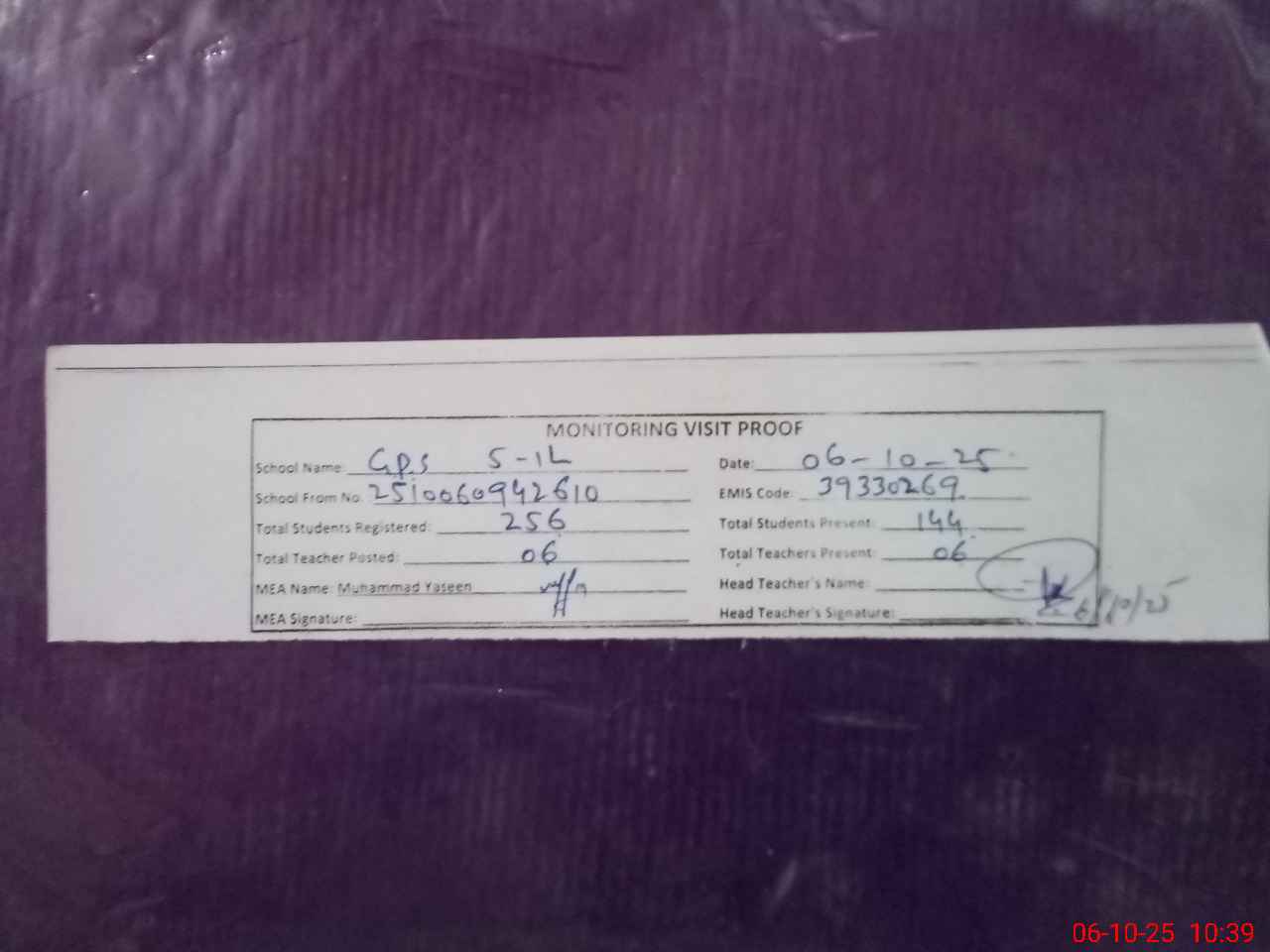 | Monitoring Date: 06-10-2025 | Start Time: 06-10-2025 09:42 AM | End Time: 06-10-2025 10:40 AM | Name of MEA: MU**** YA**** | |