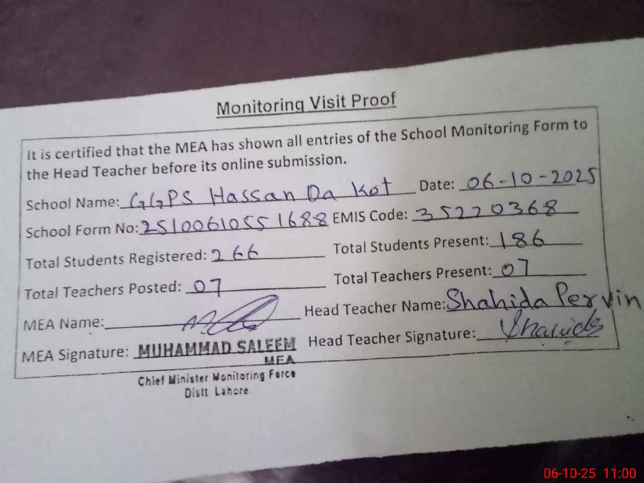 | Certified that this School was Inspected by the Undersigned MEA/DMO Today and the Information Stated Above is as Per Record. | |||||