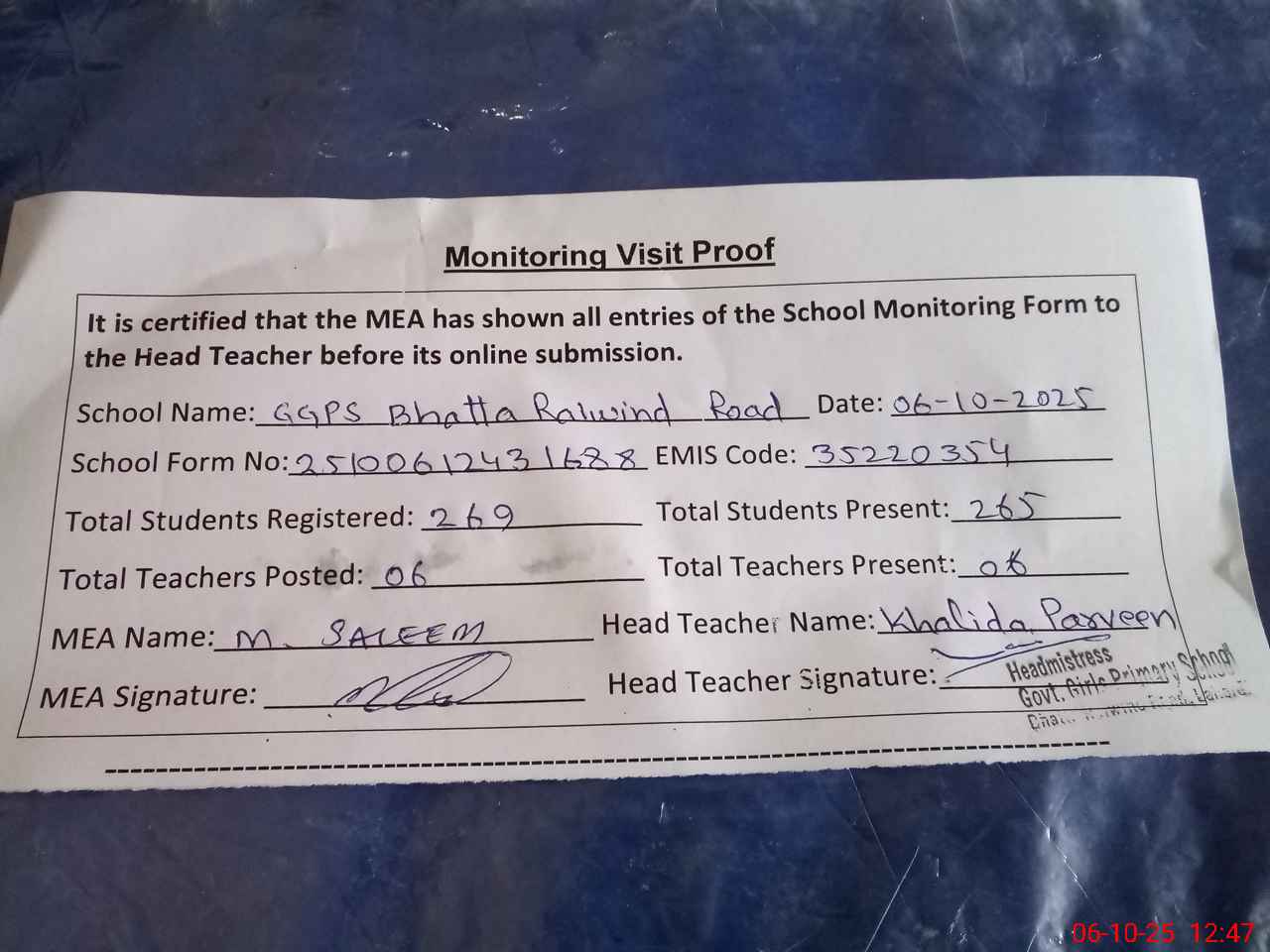 | EMIS Code: 35220354 | Name of School: GGPS BHATTA RAIWIND ROAD | |||