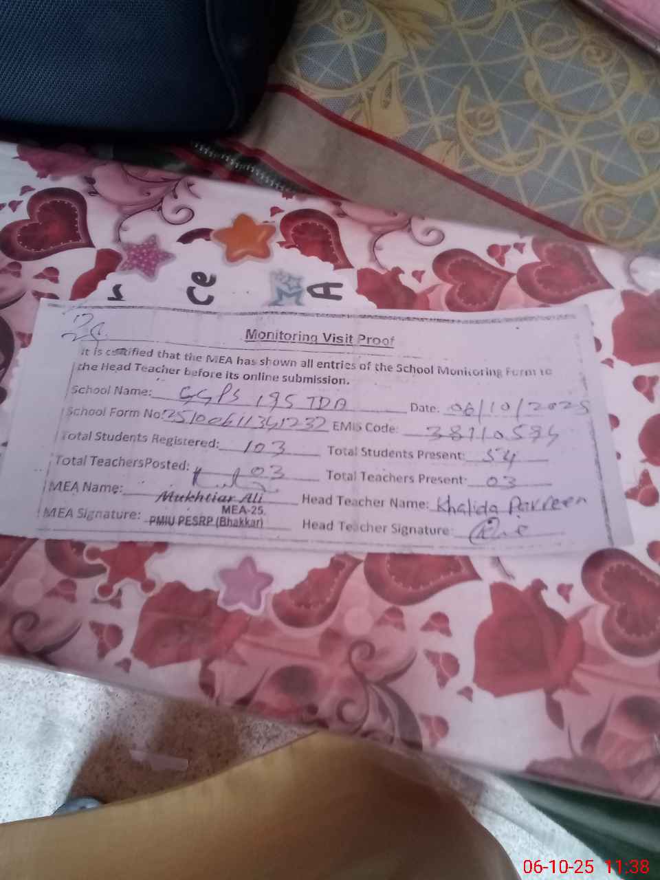 | Certified that this School was Inspected by the Undersigned MEA/DMO Today and the Information Stated Above is as Per Record. | |||||